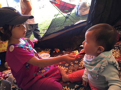 もし、1歳弱の赤ちゃんがいる場合のオススメは、ベビービョルンのバウンサーを持っていくのもオススメです。ベビービョルンのバウンサーは、ぺったんこになるので、車に積載しやすいのと、テントの中にいる場合でも、寒暖差があるキャンプでは、まだ体温調節がしにくい月齢である場合、地面と空間を作ってあげることできるので、我が家では、いつもマストアイテムでした。